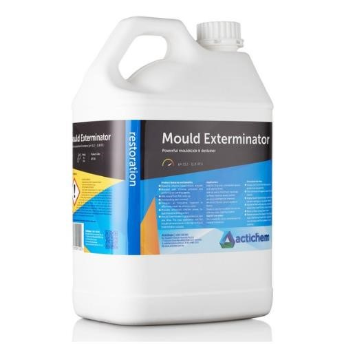 Actichem’s Mould Exterminator is the fruit of years of research into the potentiation of the chlorine activity in hypochlorite solution. This new Innovative chemistry significantly enhances the existent oxidising activity found in chlorine and in turn produces amazingly rapid collapse of the base fungal/mould cell. This incredible mould killing action has been further enhanced with super wetting agents which guarantee ultimate penetration through organic load and deep into porous substrates. Mould Exterminator’s unique, super-wetting formula, provides consistent, reliable results in mould remediation every time. Its powerful stain removal can be seen almost instantly when applied to mould affected surfaces. Mould Exterminator penetrates deep into the affected surface and completely destroys the mould hyphae and root system. This ensures A 100% clearance report on every mould remediation job. Another unique benefit of Mould Exterminator, is that it is a safe, ready-to-use product. No more mixing required. Size: 5L