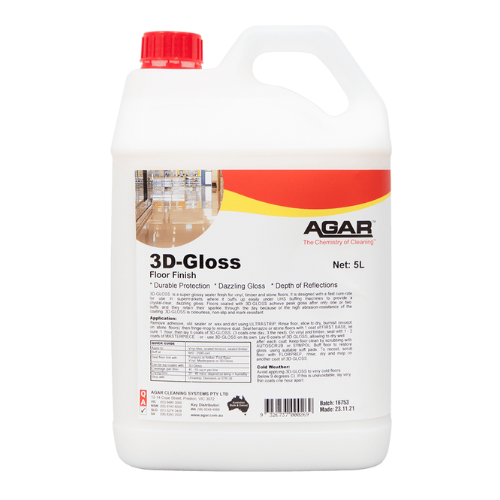 . 3D-GLOSS is a super-glossy sealer finish for vinyl, timber and stone floors. It is designed with a fast cure rate for use in supermarkets where it buffs up easily under UHS buffing machines to provide a crystal-clear, dazzling gloss