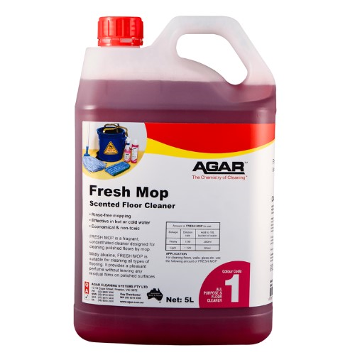 HOW IT WORKS. Fresh Mop is a lemon-scented mildly alkaline cleaner that will remove fats, oils, dirt, spillages, vehicular road dirt, floor traffic, soilage and spills of all kinds from all hard surfaces, polished floors, tiles, fittings, windows, ducting, walls and paintwork. Fresh Mop is safe on terrazzo, marble and slate, cars and trucks. Fresh Mop is ideal for any surface not harmed by water