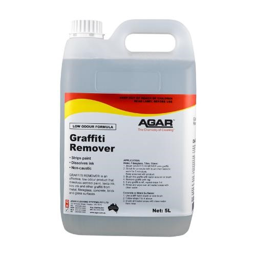 PRODUCT DESCRIPTION. Agar Graffiti Remover 5L is a heavy-duty, solvent-based cleaner formulated to dissolve and remove graffiti from a wide range of hard surfaces with speed and precision. It effectively breaks down spray paint, ink, permanent marker, adhesives, and crayon, making it ideal for councils, schools, facility managers, and commercial cleaners. The non-drip, gel-like consistency clings to vertical surfaces—allowing extended contact time for better results. Supplied in a convenient 5L bulk container, it's perfect for larger jobs or routine graffiti maintenance across urban and industrial environments