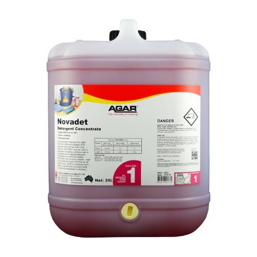 PRODUCT DESCRIPTION. Agar Novadet Concentrate Detergent is a heavy-duty, multi-purpose alkaline cleaner and degreaser engineered for industrial-strength cleaning in commercial kitchens, workshops, and manufacturing environments. This concentrated formula rapidly dissolves grease, oils, carbon, and stubborn grime from hard surfaces while being non-toxic, biodegradable, and safe for food-prep areas. Novadet delivers reliable cleaning power on floors, machinery, tiles, walls, and stainless steel, and is suitable for both manual and machine use in demanding environments