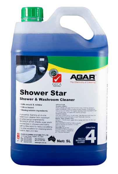 High-performance shower and bathroom cleaner designed to remove soap scum, body fats, mineral deposits and grime from wet-area surfaces.