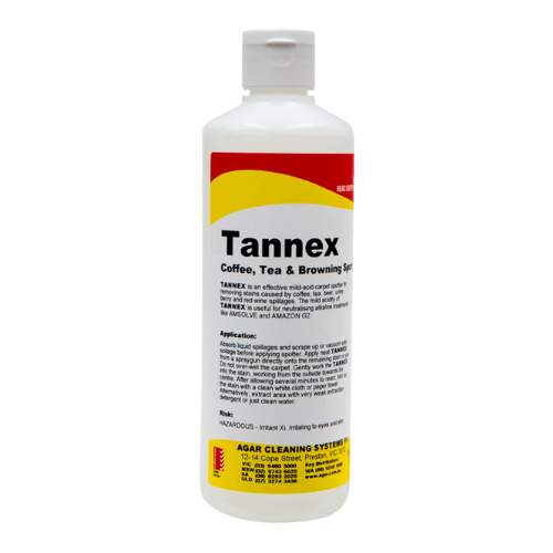 . TANNEX is a mildly acidic carpet spotter for removing stains caused by coffee, tea, beer, urine, berry and red wine spillages. It is also useful for treating water stains and jute-stain browning from carpet backing fibres. The mild acidity of TANNEX is useful for neutralizing alkaline treatments like AMSOLVE and AMAZON G2