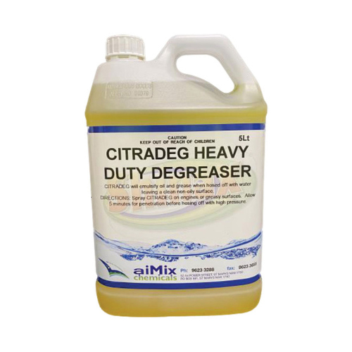 Aimix Citradeg Degreaser 5L is a citrus-based degreaser designed to break down and remove oil, grease, wax, grime and industrial residues from a variety of hard surfaces.