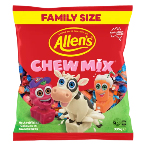 .Allen's Chew Mix is packed with a mix of creamy Milko Chews, tangy Sherbies and Red Ripperz chewy lollies. They are individually wrapped which makes them perfect for sharing. Size: 335g