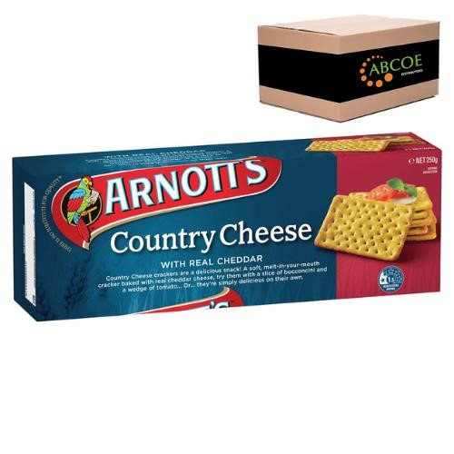 Arnott's Crackers Country Cheese with real cheddar. Country Cheese crackers are a delicious snack! A soft, melt-in-your-mouth cracker baked with real cheddar cheese, try them with a slice of bocconcini and a wedge of tomato... Or... they're simply delicious on their own. Australian Made. Contains: Barley, Gluten, Milk, Soy, Wheat and may contain traces of Egg, Peanuts, Sesame and Tree Nuts. Size: 250g. Quantity: 20 packs per carton