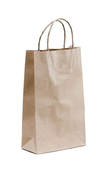 Baby brown kraft paper bags with brown paper twisted handles. This traditional bag is made from high quality Kraft paper sourced from plantation forests.