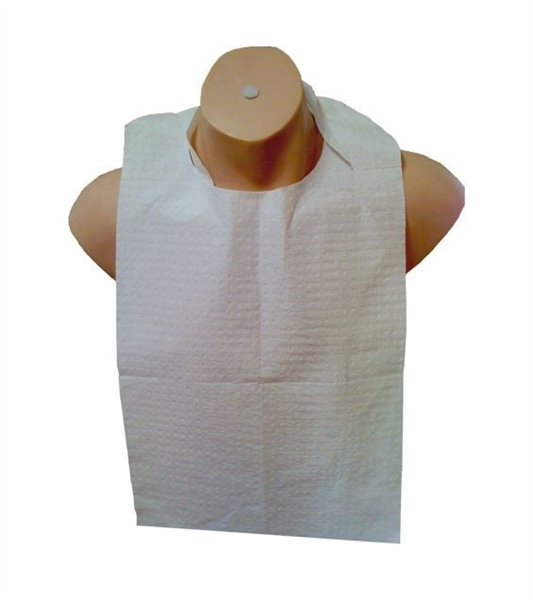 . Keeps clothes clean and dry. Oversized to cover chest and lap. Paper front absorbs liquids quickly. Waterproof backing prevents leaks. Convenient tie straps for secure fit. Value pack of 100 disposable bibs