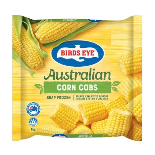 Birds Eye Corn Cobs. Australian Grown. Great sorce of Folate and Fibre. All Natural. No added Colours, Flavours or Preservatives. Size: 1kg