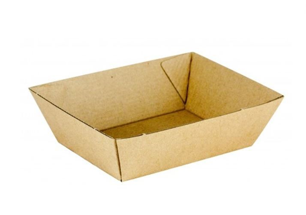 Board Tray #1. 130Lx92Wx50Dmm.The range is light and sturdy, designed for stand up and sit down meals at food markets. The funky, tapered design presents food in an insulated e-flute board and a favourite among food trucks and the like. Made from recyclable materials. Recyclable.