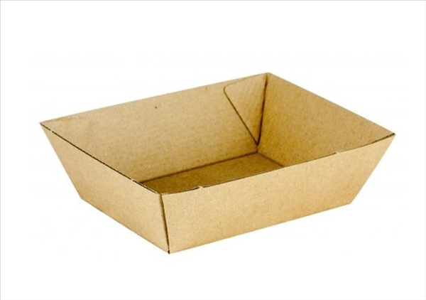 Board Tray #1. 130Lx92Wx50Dmm.The range is light and sturdy, designed for stand up and sit down meals at food markets. The funky, tapered design presents food in an insulated e-flute board and a favourite among food trucks and the like. Made from recyclable materials. Recyclable. Carton Qty 500.