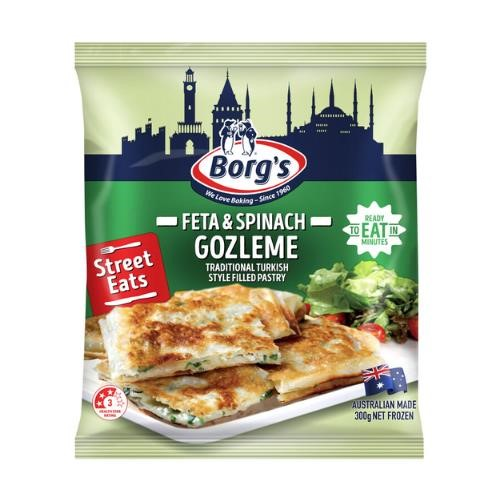 Borg's Feta & Spinach Gozleme is a traditional Turkish style filled pastry. Ready to eat in minutes. No artificial colours or flavours. No added preservatives. Australian Made. Size: 300g