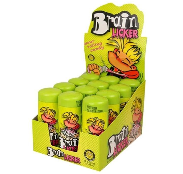 Roll it on your tongue! Brain lickers are filled with cola flavoured, sour liquid candy! Assorted flavours including blue raspberry, strawberry, grape and now a new cola flavour!