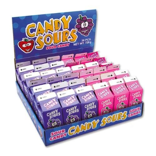 36 small cartons filled with Sour Candies - Strawberry and Grape Flavours
