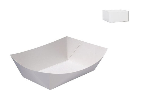 RediServe Paper Food Trays #3. Poly-Lined. White. Size: Medium. 210 x 140 x 55 mm. Qty: 125 per sleeve. 500 per carton. Item: CA-TR3-W.