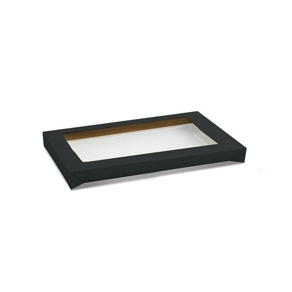 Suitable for black corrugated rectangle catering tray. Made from natural cardboard with PET window. Clear and highly transparent. To suit BLCTM