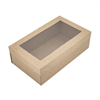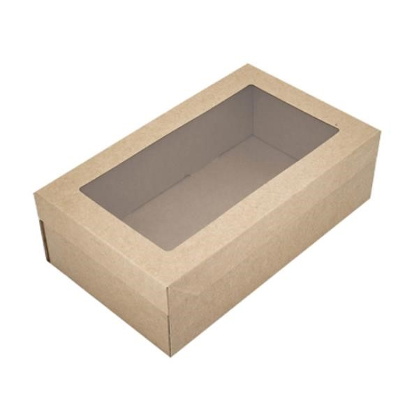 Made from brown kraft paper with a clear plastic window, these catering boxes are not only environmentally friendly but also stylish and sleek looking. Able to transport most types of food such as bread, pastries, fruit or cheese. Size: 258mm x 150mm x 80mm. Colour: Kraft/Brown. Quantity: 100 Cater boxes per carton
