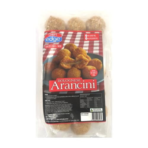 Chefs Edge Arancini Balls Bolognaise Pouch. No added MSG. No preservatives. Servings: Approx 16 Arancini Balls per pack. Size: 400g