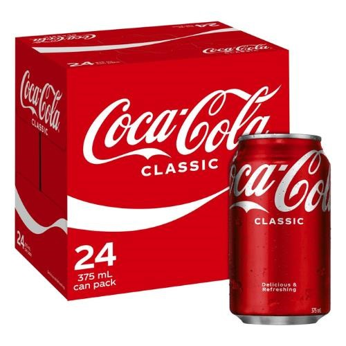 Coca-Cola Classic Soft Drink, Nothing beats the taste of Coca-Cola Classic. It's the perfect companion whether you’re on the go, relaxing at home, enjoying with friends or as a drink with your meal. Refresh with the authentic Coke taste. Size: 375ml Cans. Quantity: 24 Cans Per Carton