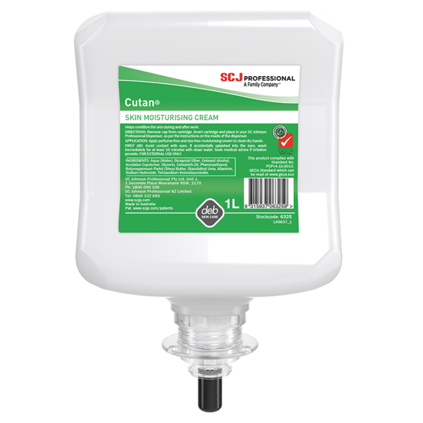 Cutan Moisturising Cream. The Cutan Moisturising Cream is a mild dye-free and perfume-free. It’s non-greasy and completes the full suite of Cutan Skin Hygiene range. It contains a combination of emollients and conditioning ingredients to maintain healthy skin and reduce dryness. Size: 1L. Quantity: 6 Pods Per Carton