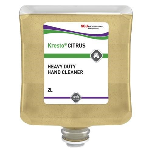 PRODUCT DESCRIPTION. Deb Kresto Citrus 2L 4/CTN is a heavy-duty industrial hand cleanser formulated with natural cornmeal scrubbing agents and refreshing citrus extracts to deliver exceptional cleaning power. Designed to remove deeply ingrained and stubborn soilings such as tar, inks, bitumen, adhesives, most oil-based paints, oil, grease, and general grime, it works quickly to make hand washing faster and more effective. The non-abrasive cornmeal scrubbers provide a deep clean without harming the skin and are easily rinsed away, preventing clogged drains and pipes. With a fresh citrus scent and skin-friendly formulation, it leaves hands clean, smooth, and revitalised. Supplied in a bulk carton of 4 x 2L bottles, this pack is ideal for high-use industrial and commercial environments