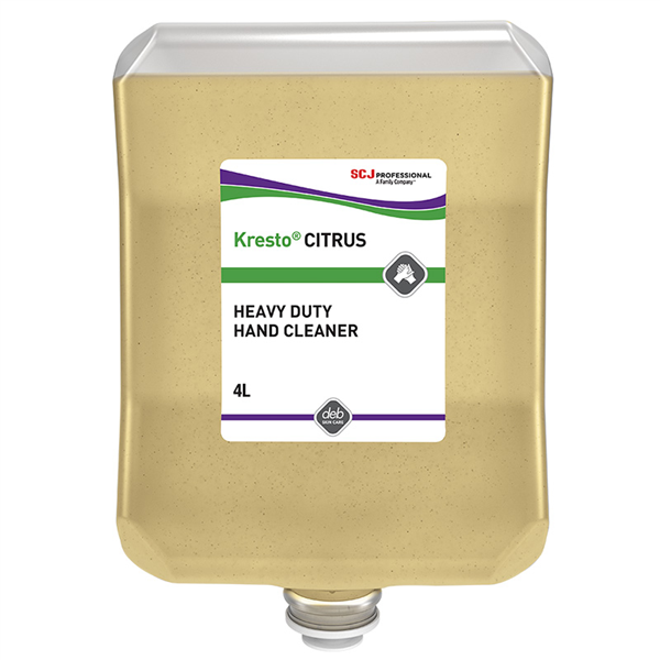PRODUCT DESCRIPTION. Deb Kresto Citrus Hand Cleanser 4L 4/CTN is a powerful and versatile heavy-duty hand cleanser formulated to tackle deeply ingrained and hard-to-remove soils. Infused with natural orange oil extract, it delivers rapid cleaning action that cuts through stubborn grease, oil, and grime quickly and effectively. The formula includes cornmeal scrubbing agents that are natural, non-abrasive, and biodegradable, providing a deep clean without harming the skin or the environment. Enhanced with Jojoba Oil and Wheat Germ Oil, a rich source of Vitamin E, it conditions and nourishes the skin, leaving hands smooth and firm with a pleasant fresh citrus scent. Supplied in a carton of 4 x 4L bottles, this cleanser is ideal for high-demand workplaces