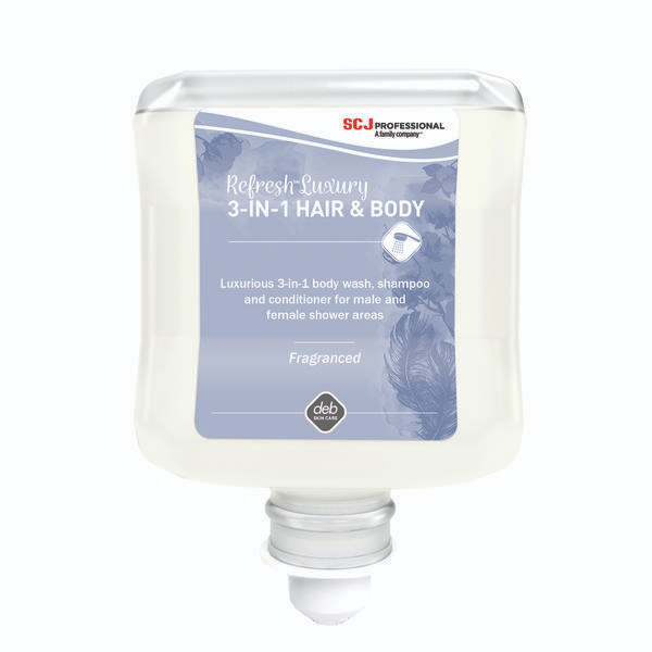PRODUCT DESCRIPTION. Deb Refresh Luxury 3-in-1 Hair and Body 1L 6/CTN is a premium unisex shower solution that combines body wash, shampoo, and conditioner in one convenient formula. This high-quality creamy lotion produces a rich, luxurious lather that gently cleanses while leaving hair and skin smooth, soft, and conditioned. Designed for frequent use, it provides a refreshing and pampering experience in workplace, leisure, and hospitality shower facilities. Supplied in cartons of 6 × 1L bottles, it offers an efficient and cost-effective solution for professional environments