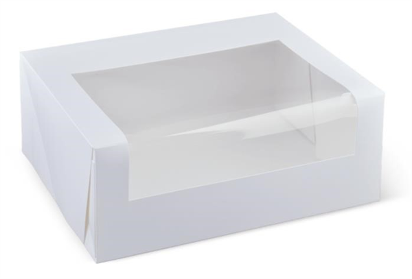 The 6 cupcake window box holds 6 cupcakes for takeaway. It can be fitted with an insert to securely hold the cupcakes in place (available seperatley 47-CBXI6CC). The window showcases the delicious cupcake treats inside. The smooth white sides can be easily customised with stickers. Size: 360(L) x 255(W) x 100(H)