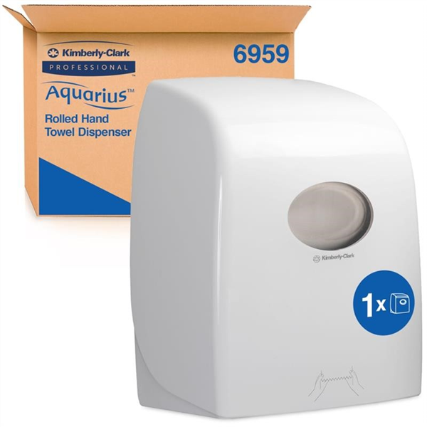 PRODUCT DESCRIPTION. Dispenser Aquarius Hard Roll Towel is a high-capacity, hygiene-focused dispensing solution designed to reduce waste and support busy workplaces. Featuring a controlled dispensing system, it measures each towel length to prevent overuse while its touch-free operation allows users to retrieve towels without touching the unit, promoting superior hygiene. Certified by HACCP International, it is suitable for use in food preparation and healthcare environments. This dispenser is compatible with KLEENEX Hard Roll Towel (6765) and SCOTT Hard Roll Towels in white (1005) or blue (6668), holding rolls up to 305m in length. Constructed from durable white high-gloss ABS plastic, it has smooth, continuous surfaces that are easy to clean and a contemporary design that blends seamlessly into professional spaces. A convenient viewing window makes it easy to monitor stock levels, and the lockable design deters pilferage. Measuring 326mm x 430mm x 241mm, it provides a reliable, efficient, and hygienic hand-drying solution