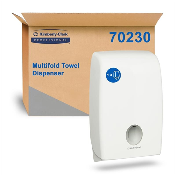 is a hygienic and efficient dispensing solution designed to promote cleanliness and reduce waste in busy washrooms. With single-sheet dispensing, it ensures users only touch the towel they use, minimising cross-contamination and limiting overuse. The touch-free system enhances hygiene further, while its HACCP International certification makes it suitable for hygiene-sensitive environments. Featuring a modern white high-gloss ABS plastic finish with smooth, easy-to-clean surfaces, it blends seamlessly into professional spaces. A convenient viewing window allows staff to monitor towel levels for efficient refilling, and the lockable design helps deter pilferage. Measuring 280mm x 232mm x 116mm, this dispenser is compatible with KLEENEX Multifold Towel (1890) and SCOTT Multifold Towels (13207, 38002)