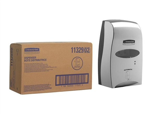 KEY BENEFITS. Sleek chromed finish delivers a modern, professional look. Touch-free electronic dispensing reduces contamination risk. Suitable for foam soap or sanitiser use. Wall mount or use with Kimberly-Clark dispenser stand 11430. Controlled dispensing reduces waste and costs. Holds 1.2L cartridges for high-capacity performance
