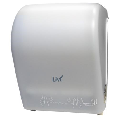 PRODUCT DESCRIPTION. Dispenser Livi Hand Towel Auto Cut is a durable, touch-free dispensing solution designed to provide hygiene, efficiency, and cost control in busy washrooms. The automatic cut system ensures users only touch the paper they use, promoting superior hygiene while controlling paper consumption. Built to hold up to a 200m roll, it minimises the frequency of refills, with an emergency feed feature to assist paper advance when required. Constructed from strong, impact-resistant materials, it offers long-lasting reliability, while the double latch lock system prevents tampering and theft. Finished in clean white, it delivers a modern, professional look. Measuring 280mm x 235mm x 380mm, this dispenser is compatible with Livi 1204 rolls