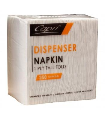 1 Ply Tall Dispenser Napkins. Tall Fold. White. Size: E-Fold. 240 x 240 mm. Qty: 250 per sleeve. 5000 per carton.