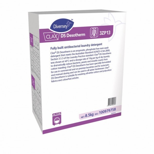 PRODUCT DESCRIPTION. Diversey Clax DS Desotherm 3ZP13 8.5kg is a high-performance antibacterial laundry detergent specially designed for institutional and professional applications. Combining powerful cleaning agents with germ-killing action, this advanced formula effectively eliminates more than 99.9% of bacteria while removing stubborn organic stains such as blood, food residues, and body fluids. Ideal for use in healthcare, hospitality, and food service settings, it delivers hygienic, deep-clean results in every wash