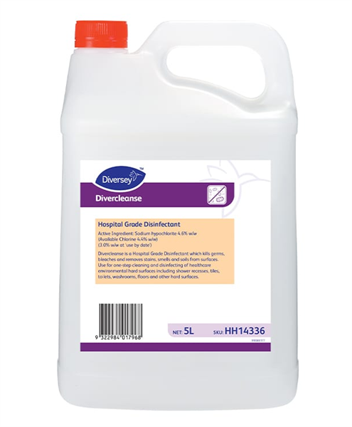 Diversey Divercleanse is a hospital-grade, one-step liquid disinfectant cleaner powered by sodium hypochlorite (bleach).