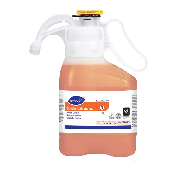 Diversey SmartDose Stride Citrus HC 1.4L is a highly concentrated neutral floor cleaner designed for efficient cleaning of hard floors.