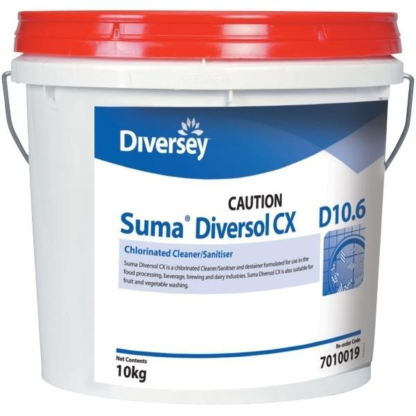Diversey Suma Diversol CX is a chlorinated powder cleaner, sanitiser, and destainer designed for food preparation, food processing, beverage, brewing, and dairy environments.