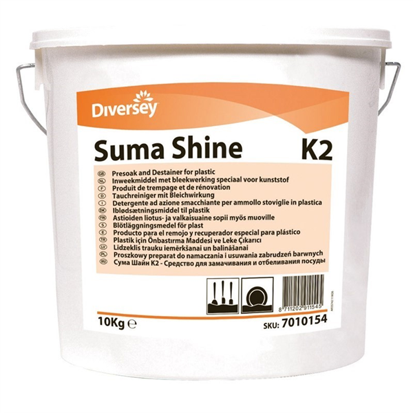 PRODUCT DESCRIPTION. Diversey Suma Shine is a professional-grade powder destainer and presoaker formulated to remove stubborn stains, starches, and burnt-on residues from cups, crockery, melamine, and plastic surfaces. Perfect for commercial kitchens, cafés, and institutional food service operations, this powerful soaking agent restores items to a hygienically clean condition while being safe on delicate materials. Its high-activity formula penetrates and lifts tannin stains from tea, coffee, and wine, making it an essential part of your warewashing routine