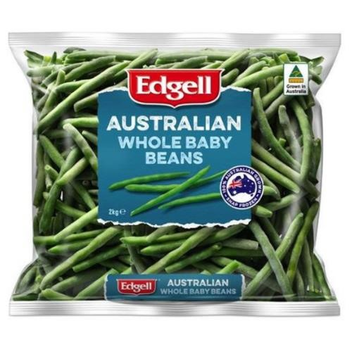 Edgell Beans Whole Baby. Australian grown snap frozen young & tender whole baby beans. Australian made. Size: 2kg