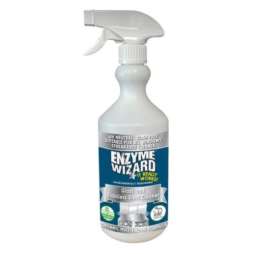 . The Enzyme Wizard Glass and Stainless Steel Cleaner contains a proprietary blend of enzymes and surfactants which breaks down dirt, oils, grease and other organic material, leaving glass and stainless steel clean and streak-free.