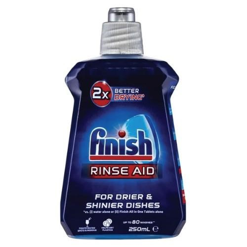 Finish Rinse Aid. Finish Dishwashing Rinse Aid can be used to clear away detergent and food residues from dishes in your dishwasher. While it removes tough stains from your dishes, it also leaves them with a bright shine making them more appealing for the next use. Clear away detergent and other residue from your dishes with this rinse aid. The formula not only cleans dishes, but makes them shine as well. This rinse aid can be used along with other cleaning detergents in your dishwasher.It has a fresh scent to leave your dishwasher smelling pleasant. Approximately 80 washes worth inside. Size: 250ml
