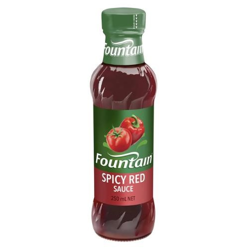 Fountain Spicy Red, Get spicy with Fountain Spicy Red Sauce. Containing no artificial colours or flavours, it can be used in meals such as nachos and pasta, or as a dipping sauce for hot chips and potato wedges. Perfect with burgers, steaks and hotdogs. Spicy sauce made with tomato and capsicum. Contains: Peanuts, Soy, Wheat, and Gluten. Size: 250ml