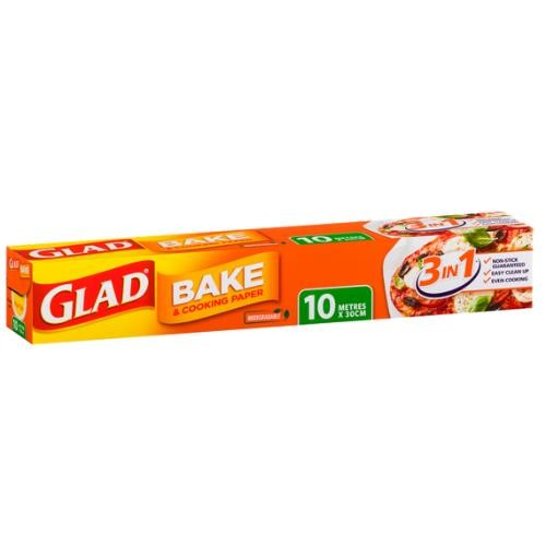 Glad Bake & Cooking Paper is specially designed with double sided, non-stick coating that stops food from sticking. This super versatile paper is heat resistant up to 230°C making it ideal for ovens, fry pans, microwaves, sandwich makers and even BBQ hotplates (not near naked flames). It removes the need for extra fats or oils when cooking, making meals healthier and easier to prepare. Protect cookware, reduce mess and clean-up faster with Glad Bake & Cooking Paper. Size: 10m x 30cm.