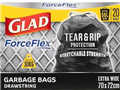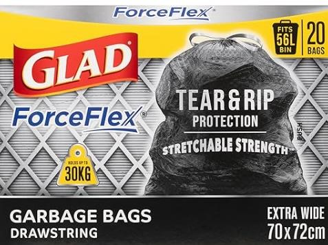 Glad ForceFlex Drawstring Garbage Bags – 56 L capacity.