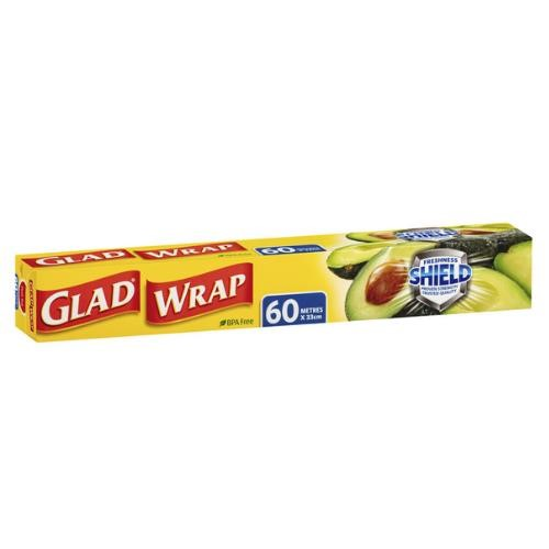 Glad Wrap provides longer lasting freshness with proven strength. Clings tight and seals easily to protect and preserve prepared food. The Freshness Shield and the easy to dispense system make covering and portioning food fast and simple. BPA free and made from non-toxic polyethylene, it is perfect for reheating food in the microwave and great for wrapping food for freezer storage. Just click in the secure side core lock tabs to activate the dispensing system and rely on Glad Wrap's proven strength and trusted quality to keep your food fresh. Prepare, Protect & Portion. BPA Free. Microwave & Freezer Safe. Size: 60m x 33cm
