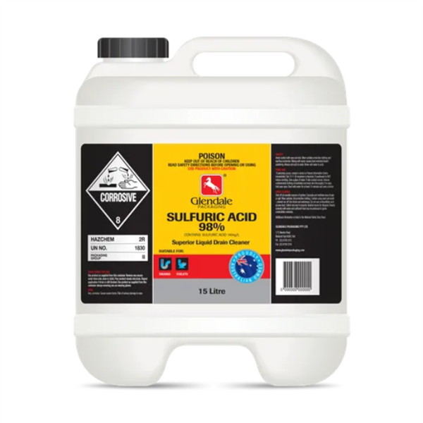 Glendale Sulfuric Acid 98% 15L is a high-strength concentrated acid suitable for industrial and professional applications.