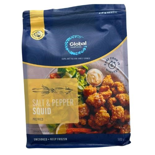 - Global Seafoods tender pieces of wild caught squid lightly seasoned in our classic salt and pepper coating.