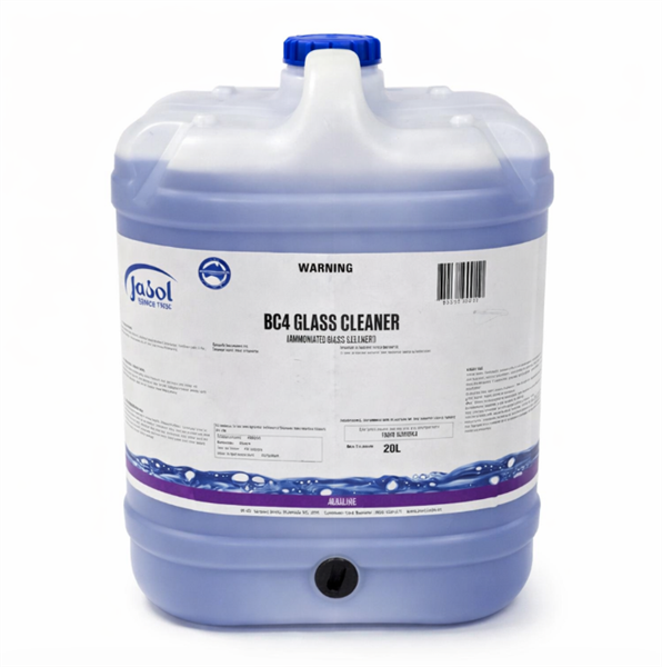 PRODUCT DESCRIPTION. BC4 Glass Cleaner 20L is a ready-to-use, premium spray-and-wipe cleaner specially designed for large-scale commercial and industrial cleaning. This high-performance formula quickly dissolves fingerprints, smudges, grease, and dirt on glass, mirrors, stainless steel, and other glossy surfaces—leaving a sparkling, streak-free finish every time. Non-flammable and HALAL approved, BC4 Glass Cleaner is ideal for use in sensitive environments such as food facilities, healthcare, hospitality, and public spaces. Its 20L bulk size is perfect for high-traffic areas requiring frequent cleaning