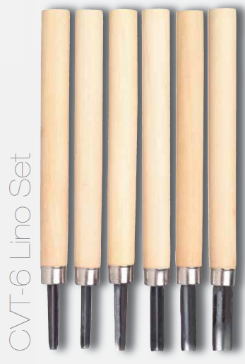 Comprehensive set of six tools allows fine detail and broad gouging work in linoleum and soft carving blocks.