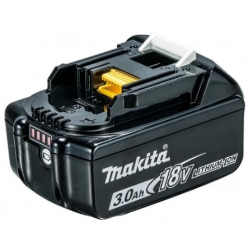Makita Battery 18v Li-Ion Battery 3.0AH. Fuel gauge indicator, displays charge remaining on battery in four stages. Built in memory chip communicates the usage history with the charger. Built in shock absorbers protect the cells from jobsite conditions. High energy cells pack more power per cell to reduce number of cells and overall weight. Large release button for easy removal from the tool. Built in air vents and wall cools the battery cells evenly whilst blocking damaging debris. 16 contact terminals provide consistent power and firm hold in any environment. Cell Capacity: 3.0AH. Voltage: 18V. Charge Time: 22 Minutes. Code: BL1830B-L